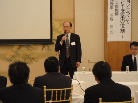 続いて行われた講演会では、「山梨県産業振興ビジョンについて」と題し、公益財団法人やまなし産業支援機構手塚専務理事より講演がありました。講演では、産業振興ビジョンで出された5つの成長産業分野についての説明と、その発展を支えるICT産業の重要性及び、ビジョン実現のため、やまなし産業支援機構とYSAとの協働についての話がありました。